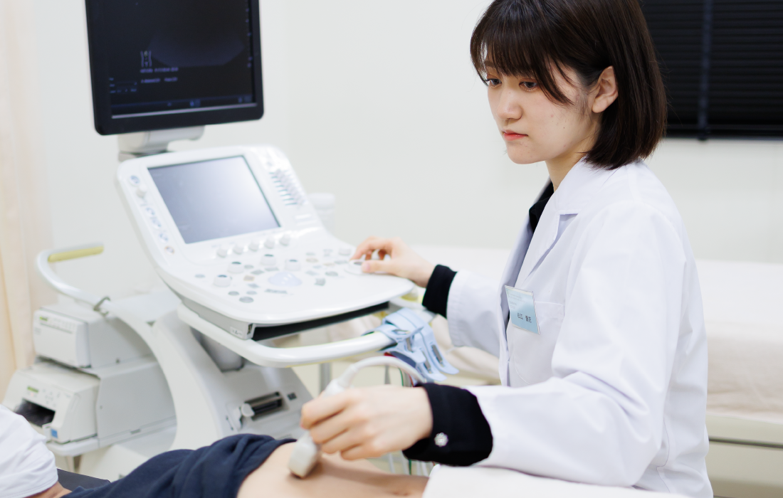 超音波検査は人体に無害であり、また病気の診断に有効な検査であるため、診療において重要視されています。本校では医療現場と同様の超音波装置を用いて超音波実習を行い、心臓の動きや肝臓の状態を観察する訓練を行っています。